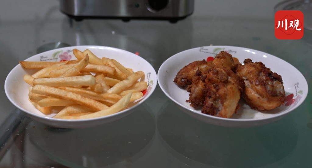 用起酥油炸鸡和薯条,炸物呈金黄色,气味香浓,外酥里嫩。刚炸出来食用酥脆可口,但是温度一降下来,炸鸡和薯条上面的油脂凝固,再次食用嘴里会有粘黏感。