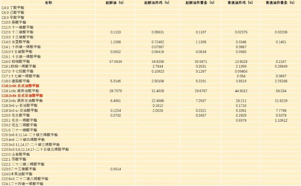 很多人担心使用起酥油制作油炸食品,会产生对人体有害的反式脂肪酸,我们将起酥油和以上实验中的炸物送到农科院分析检测中心,进行脂肪酸组成(每种脂肪酸在油脂中的占比)检测。