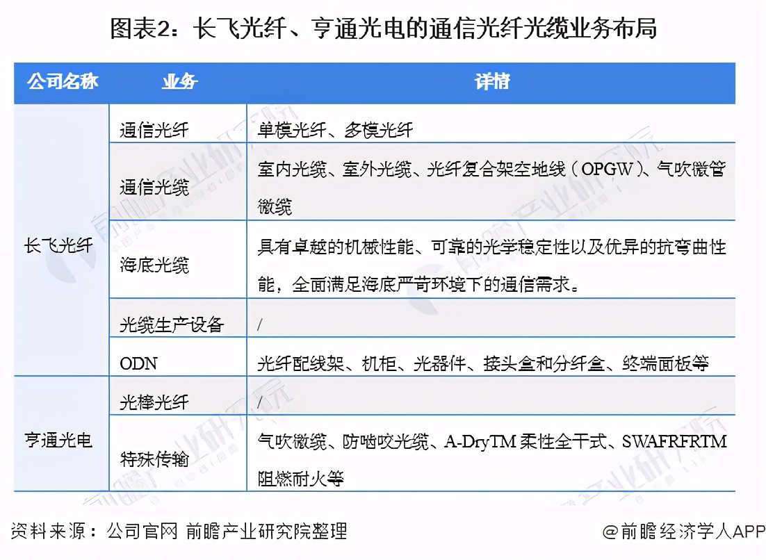从通信光纤光缆业务布局来看,长飞光纤和亨通光电都在光纤光缆方面实现了全方面的覆盖。