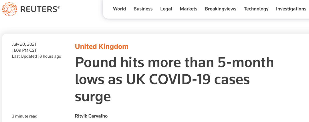 路透社认为,英镑大跌的背后是因为全球感染率上升引发投资者担忧,纷纷开始竞购债券和美元。