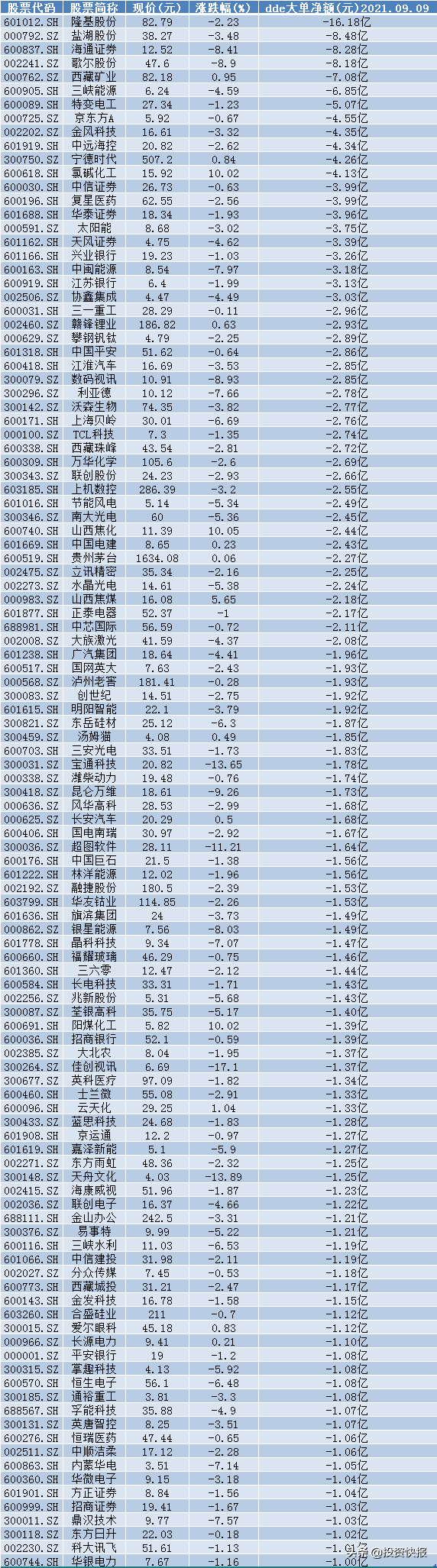 具体来看,主力资金出逃最多的是隆基股份,大单净流出高达16.18亿元。另外,盐湖股份、海通证券、歌尔股份、西藏矿业、三峡能源、特变电工、京东方A、金风科技、中远海控、宁德时代、氯碱化工等11只个股均遭到超4亿元的资金抛售。