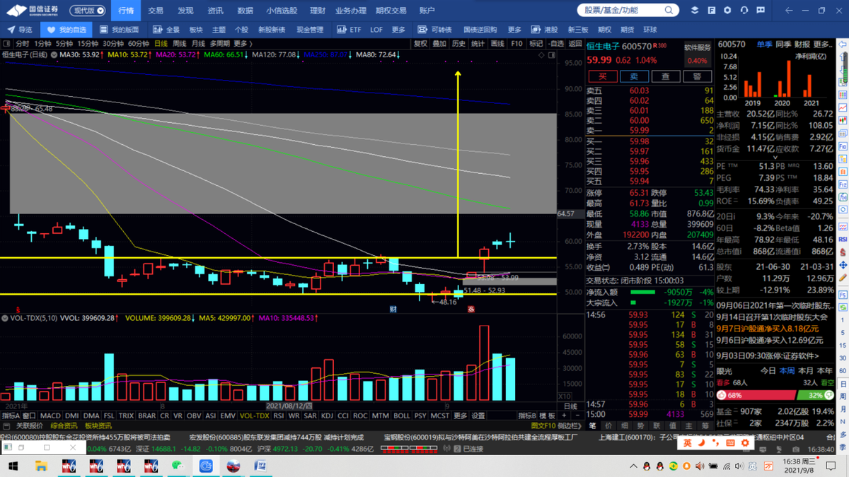 受益北交所利好的600570恒生电子收涨1.04%,走势以小碎步走升,突破平台之后一般有5个交易日站稳就基本上确认突破有效进入主升浪,有15家以上的券商集体看好,看好的券商家数有可能还会增加。证券公司一般有强大的自营盘资金,如果形成合力一般在走势上能看得到现在两市每日都成交额超过万亿,行情走强则恒生电子就有可能会超越2015年那轮上涨行情的走势。恒生电子跳空缺口涨停板后继续走强,从下图中可以看到明显突破颈线进入上涨周期,有可能主升浪预期已就此展开。