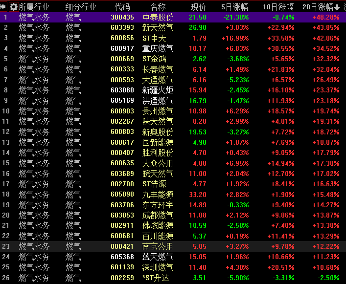 20日涨幅前五的上市公司(刨除st类上市公司)是中泰股份(48.28%)、新天然气(43.85%)、重庆燃气(34.52%)、长春燃气(33.48%)、大通燃气(26.49%);