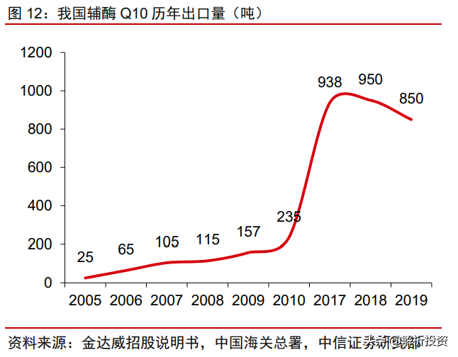 目前我国已经成为全球最大的辅酶Q10产国,2017-2019年产量分别为937.68吨、950.34吨、849.84吨,主要用于出口,全球市场份额超过90%。
