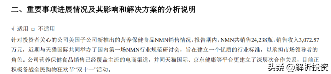 解析君也亲自到电商平台去查看,金达威的NMN产品确实是在正常销售,售价为1299元/瓶。