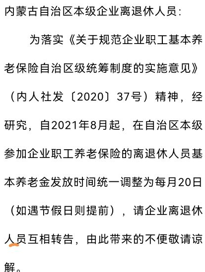 不久前,内蒙古社保事业服务中心对企业离退休人员发布了一则公告,从2021年8月起,在自治区本金参加企业退休养老保险的离退休人员的养老金发放时间调整了,统一变更为每月的20日——如果是节假日,则会提前发放。