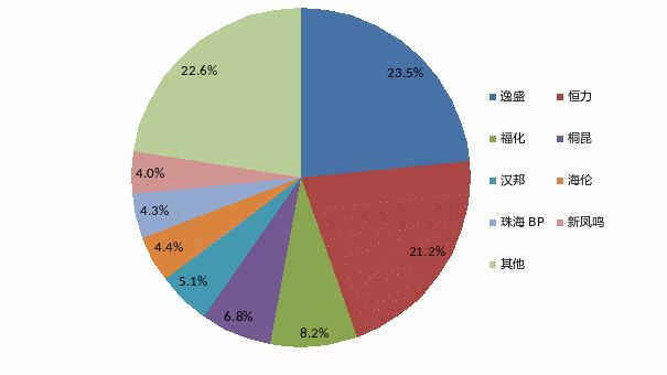 从地域分布看,PTA产能主要集中在华东、东北及华南,产能占比分别为43.6%、32.1%、17.3%。目前PTA产能主要集中在逸盛、恒力、福化、桐昆、汉邦等大型民营企业,生产装置也日趋大型化,150万及以上规模装置占比达到65%。
