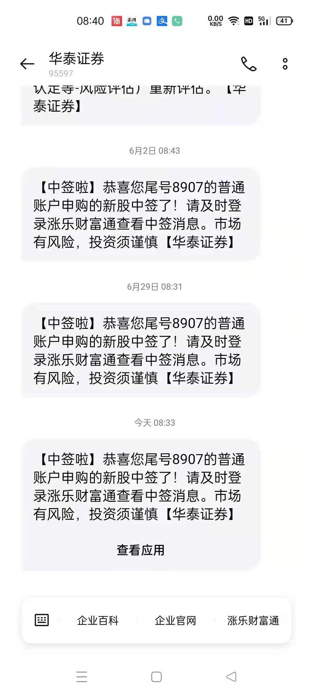 二、每天坚持打新。中新股不可能每天都能中,但你要坚持不懈、每天都不要放弃,不管多忙每天都不要忘记看下有没有新股发行。这里要说的是,现在都有预约打新了,可以防止你忘记,但是我暂时没有用,因为我这一两年打新的势头很好,经常中,我不想破坏这种习惯与平衡。包括上周另一家券商联系我说,可以给我更低的费率,让我先转部分钱去她们那里做股票,我都说要考虑下,因为我一直都是在华泰证券打的新股,一旦变动也是怕打破这种平衡。事实证明也是对的,我还没转,这周又中了,如果转了一部分谁知道呢?她说打新与哪家券商无关,与市值有关,可能吧,但我宁愿相信现在家券商确实也带给了我好运气。总之,我愿意像对待一个新生儿一样、很认真地、小心翼翼地对拥抱打新股这件事。三、选定8:45-9:00作为打新时间段。虽然打新时间规定的是8:45-15点都可以,甚至8:45前好像也可以先进入券商申购系统,后面券商再帮你申购。但是我以前在广东那边一家券商营业部,听几个大姐在那里说到一早打新可以大大提高中签率,当时不大信,觉得打新象抽签一样、就是凭个运气,什么时候打还不是一样。但一直记在心里,后来实行市值配额度打新政策后,我大都用这种策略,但有时会忘记到下午再打,甚至收盘了才发现没打,还有一段时间一直没中、加上忙都放弃了打新。到前些年开始稳定下来,形成每天早天8:45-9:00打新的习惯。