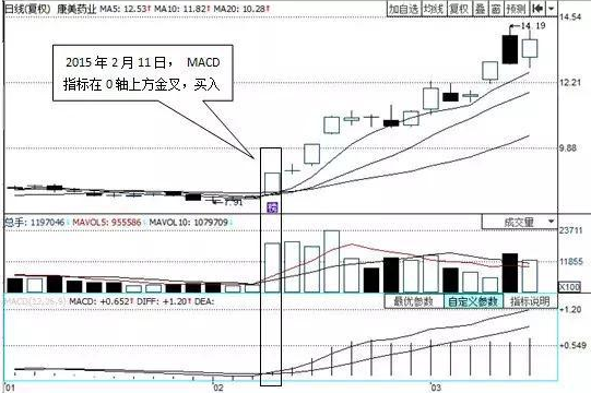 如图所示,2015年2月11日,康美药业放量阳线,同时,DIFF线向上穿越DEA线,在0轴上方形成金叉,这说明该股即将启动上涨,看到此情形,投资者可以果断追涨。此后,该股一路上涨,股价翻了一番。