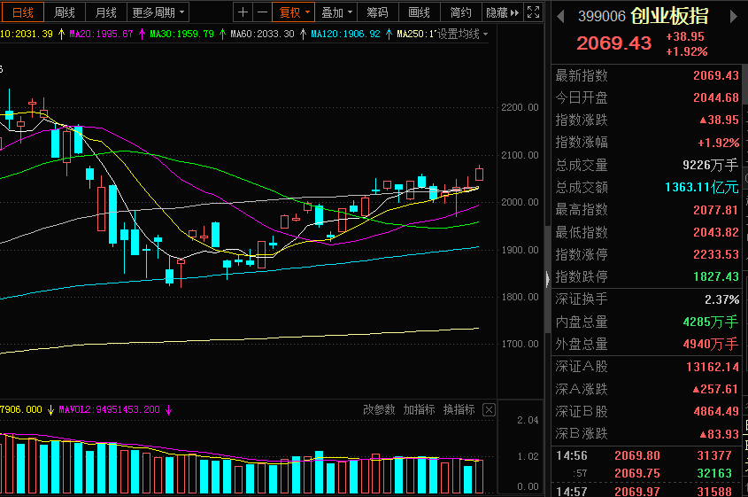 经过今天的大涨,创业板短期均线系统得到修复,出现多头排列走势,后面应该还有高度。主板这边今天有点跟不上节奏,后面还有60日线、120日线、年线压力,还需要花时间慢慢消化。