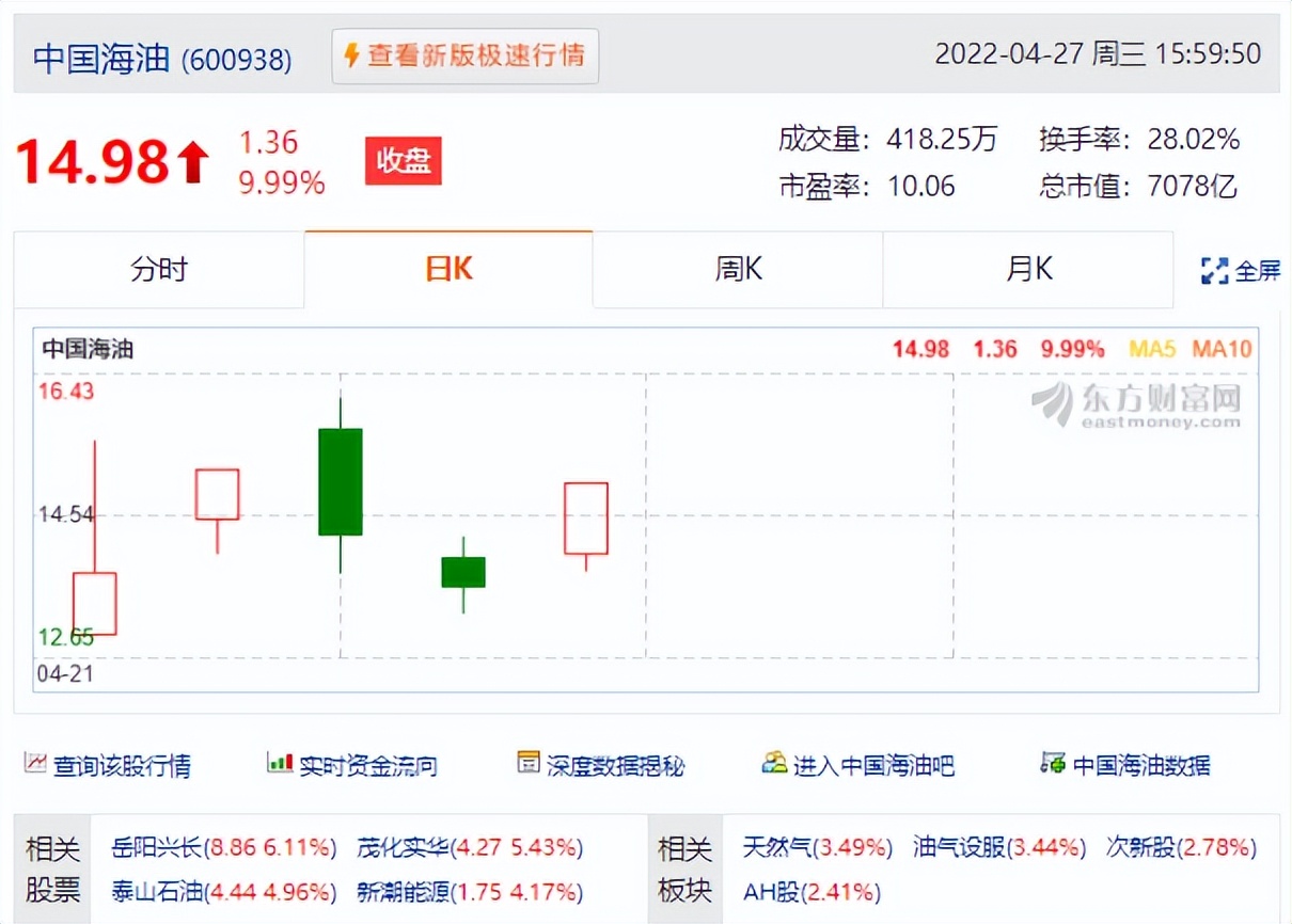 中国海油今天涨停,现在中海油和中石油都是10倍的市盈率。