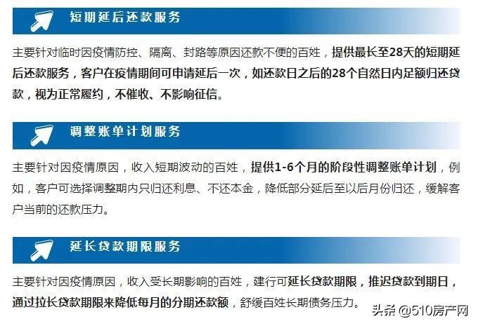 针对网民们的诉求,4月7日前后,中、农、工、建、交五大行作出回应,对受疫情影响的个人住房贷款,可提供包括延后还款时间、延长贷款期限、调整账单计划等在内的服务支持。