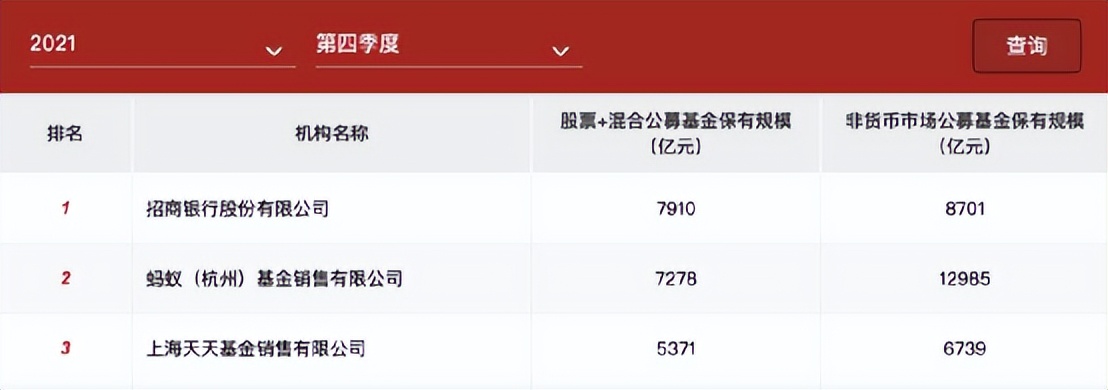 持有蚂蚁(杭州)基金销售有限公司24.10%股权的恒生电子在最新发布的年报中披露了蚂蚁基金去年的年报数据:2021年蚂蚁基金营业收入121.24亿元、净利润5.04亿元,较2020年同期分别增长101.68%、410.29%;而2019年其营业收入为18亿元,净利润刚刚接近4000万元。根据中国证券投资基金业协会公布的2021年四季度基金销售机构保有规模排名,蚂蚁基金已经是目前中国最大的第三方公募基金代销渠道。