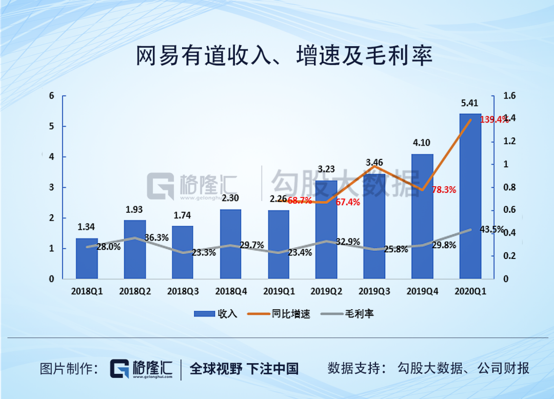 2020Q1有道的收入确实增速明显高于前几个季度,收入5.41亿元,同比增长139.4%。同时,毛利率也明显改善,达43.5%,同比增长20.1pct。