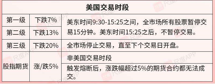 不过,暂停交易也不是任何时间都能暂停的。美股交易时间段是美东时间上午9:30-下午4:00,午间不休市(北京时间晚上9:30至次日凌晨4:00)。美东时间下午3.25之后,即使触发熔断也不会暂停交易,除非触发的是第三级熔断。