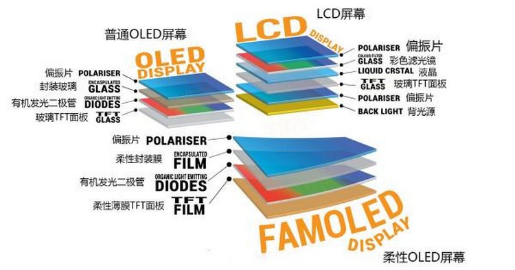 首先我们要知道的是,目前的屏幕面板基本上分为LCD和OLED两大类,两者的工作方式完全不同。LCD屏幕俗称液晶屏,是通过背光模组发光,透过液晶才能成像,结构较为复杂,不具备可弯折的特点。而OLED屏幕则是通过有机材料自发光,无需背光模组,具备可弯折的特点,所以目前市面上所有的柔性可弯折屏幕都是OLED屏幕。