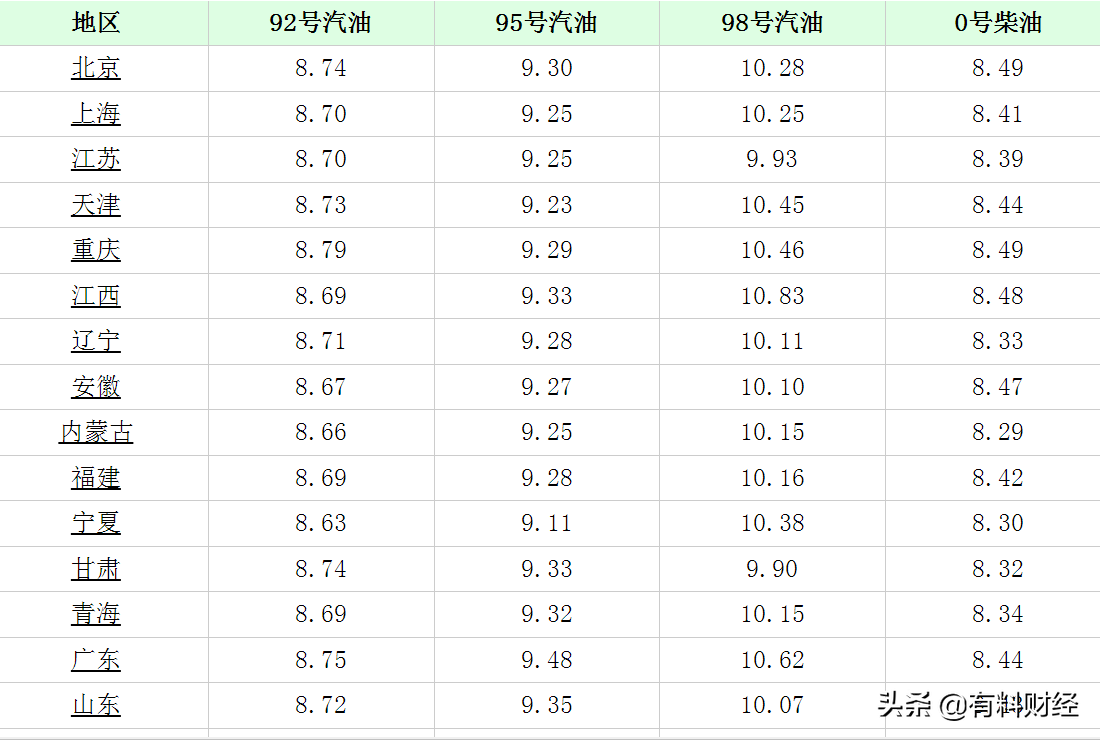北京时间4月9日凌晨,布伦特原油期货价格止跌回升,盘中一度突破103美元,最新油价102.83美元,油价涨幅2.24%;美国原油期货价格98.10美元,油价上涨2.15%;上海国际能源交易中心的原油期货主力合约SC2205,夜盘交易收盘价格637.5元/桶,油价大涨3.24%。 今天的国际市场原油价格大涨超过2%,会影响国内油价调整方向吗? 有料财经提醒车主朋友:根据发改委《石油价格管理办法》的规定,本轮国内成品油价格调整周期已经过了6个工作日,国际原油平均价格大跌12.03%,短暂的一两天油价反弹上涨行情不会改变4月15日24时全国汽油、柴油价格下调的结果。 好消息!有料财经统计了国内油价调整结果历史数据,本次每吨成品油价格下调520元超过去年12月3日每吨汽油价格下调430元的纪录,将成为最近2年以来最大的一次国内油价调整降幅! 在技术分析指标方面,布伦特原油价格在60天均线(100美元)获得了技术支撑,这个油价表现吻合有料财经在本周的油价分析文章当中的分析推断。 目前5天、10天、20天均线空头排列,构成制约油价反弹上涨的拦路虎,有料财经预计油价上涨阻力区位分别为104美元、107美元和110美元。 下周油价我们要关注100美元能否站稳,如果跌破支撑位在半年线(90美元)附近。 本轮国内油价调整时间为4月15日24时,预计全国加油站平均每升汽油、柴油价格大幅下调0.38元到0.46元, 附表是今日全国31个地区加油站的成品油零售限价信息,全国大部分地区是实行“一省一价”,加油站在发改委规定的成品油零售限价范围内销售。有料财经提醒车主朋友,贵州、内蒙古、新疆、青海、西藏,黑龙江、云南、陕西、四川、辽宁等地区加油站的汽油、柴油价格没有实现统一价格,会有一定幅度的上下浮动。 今日湖南油价:2022年4月9日长沙今日92号汽油售价为8.68元/升,今日长沙95号汽油售价为9.22元/升,今日长沙0号柴油售价为8.50元/升。 今日广西油价:2022年4月9日南宁今日92号汽油价格为8.79元/升,今日南宁95号汽油价格为9.50元/升,今日南宁0号柴油价格为8.48元/升。 有料财经:6天后国内油价调整,车主朋友做好喜迎油价下调的心理准备,全国每升汽油、柴油价格降幅大约4毛。