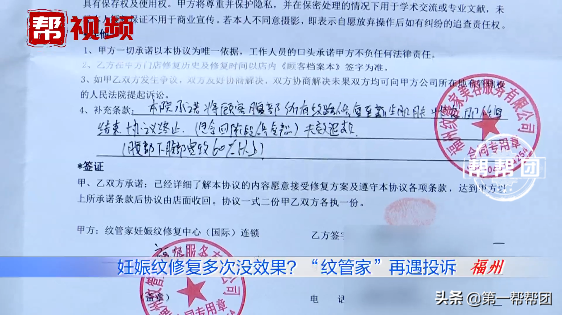 上周,帮帮团关注了福州的小陈在纹管家妊娠纹修复中心修复生长纹,说好的8到12次,结果做了17次,小陈依旧觉得没有效果的事件。节目播出之后,帮帮团也接到了市民李女士和杨女士的反映,她们也在这家美容机构修复妊娠纹,花了时间和精力不说,但也觉得没有效果。