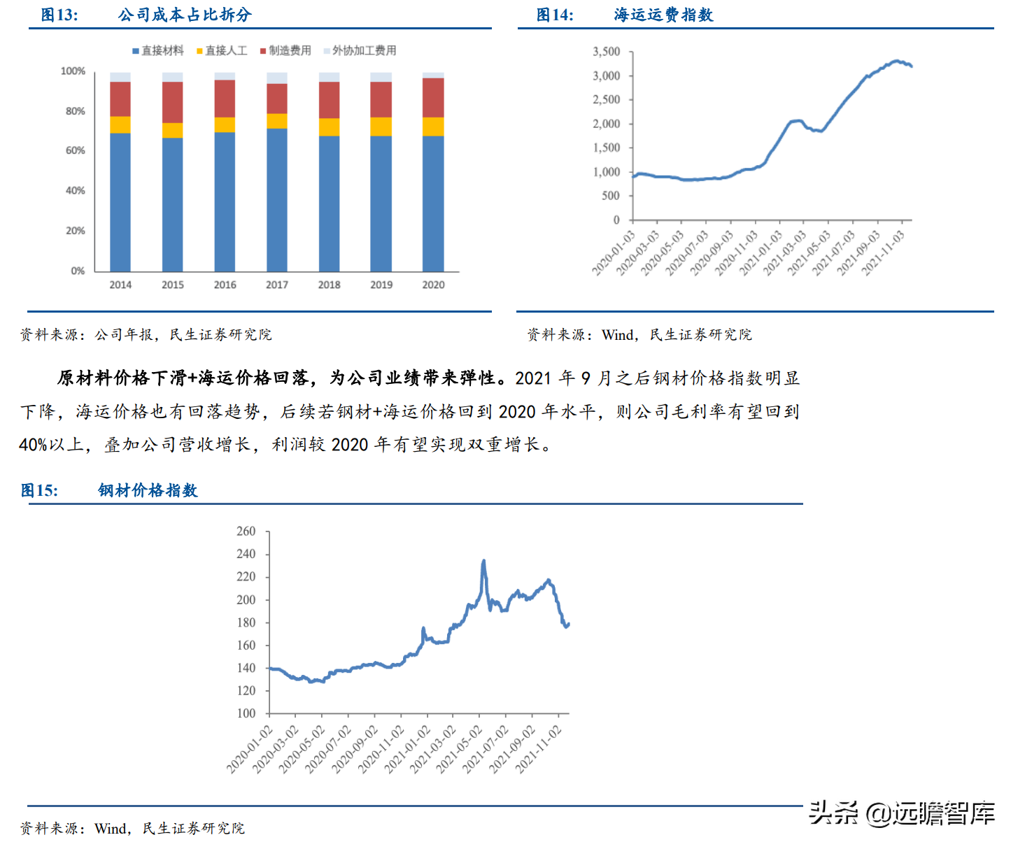 公司营业成本中直接材料费用占比约为 70%,主要原材料是钢材,2020 年以来钢材价格接近翻倍,给公司带来明显的成本压力。