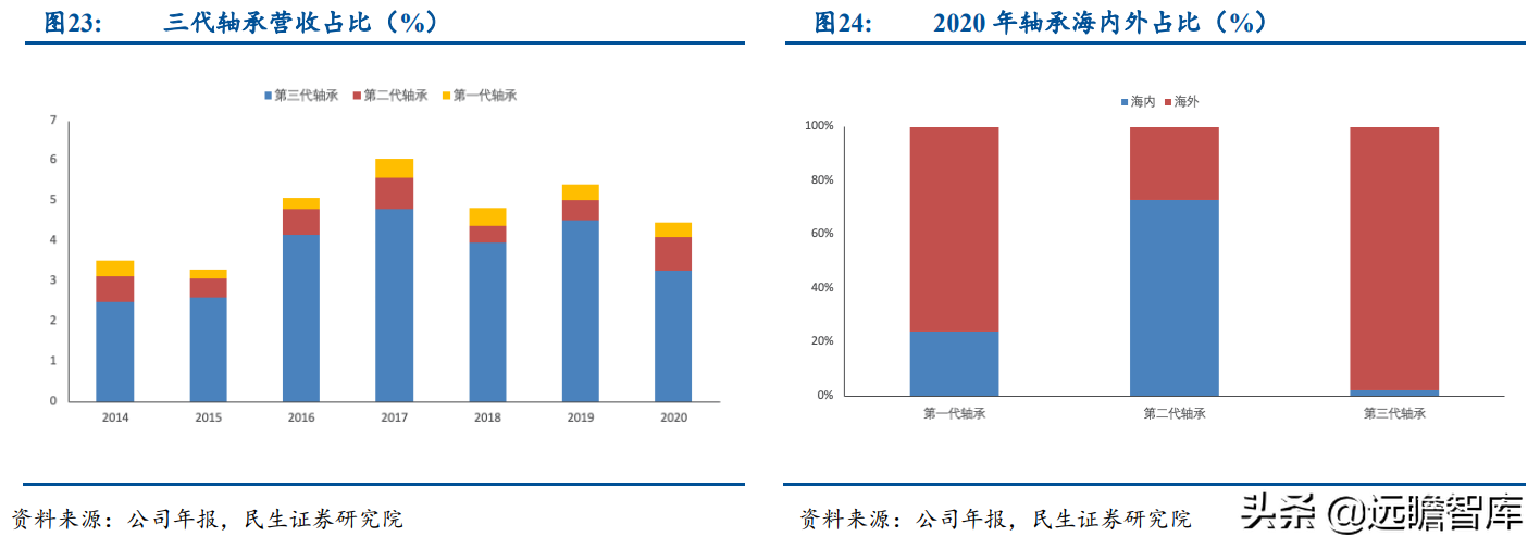 截至2020年,轮毂轴承在公司应收占比达到95.6%,三代产品技术性能不断升级,其中第三代轮毂轴承因其结构紧凑,机械性能更好,单车价值量更高,占公司整体营收超70%。