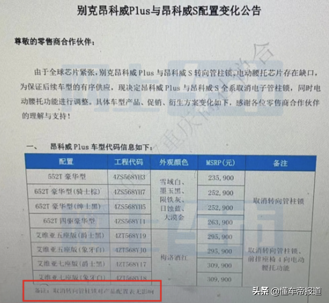 从本次曝光的疑似车辆信息公告单可以发现,因芯片问题而减配车型包括部分昂科威Plus、昂科威S和昂科威Plus艾维亚。其中,昂科威Plus和昂科威S全系取消转向管柱锁。